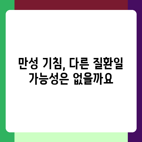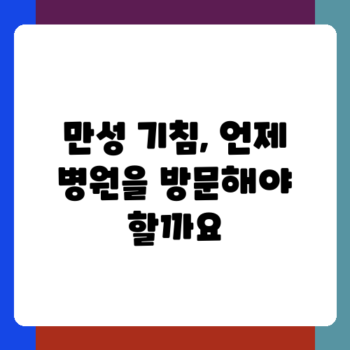 만성 기침은 일상생활에 큰 불편함을 주는 증상입니다. 기침이 2주 이상 지속되거나, 심한 기침으로 일상생활에 지장을 받는 경우, 기침과 함께 열, 가래, 흉통 등 다른 증상이 나타나는 경우, 숨이 차거나 호흡곤란을 느끼는 경우에는 즉시 병원을 방문하셔야 합니다. 조기에 진료를 받으면 질병의 악화를 방지하고 적절한 치료를 받을 수 있습니다. 병원에서는 의사의 진찰과 함께 흉부 X선 촬영, 폐 기능 검사 등의 추가적인 검사를 통해 기침의 원인을 정확하게 진단하고 적절한 치료 계획을 세울 수 있습니다. 방치하지 마시고, 꾸준히 증상을 관찰하고 필요한 경우에는 전문의의 도움을 받으세요. 본인의 건강을 스스로 지키는 것은 매우 중요합니다.