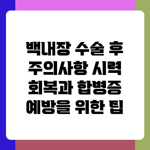 백내장 수술을 받으셨나요? 수술 후 맑아진 세상을 만끽하셨으면 좋겠어요. 하지만 수술 후 관리가 제대로 되지 않으면 시력 회복이 더딜 수도 있고, 심지어는 합병증이 발생할 수도 있다는 사실, 알고 계셨나요? 이 글에서는 백내장 수술 후 시력 회복을 돕고 합병증을 예방하는 데 도움이 되는 실질적인 팁들을 소개해 드릴게요. 성공적인 수술 후 회복을 위해 꼼꼼히 읽어보시고, 궁금한 점은 담당 의료진에게 문의하세요.